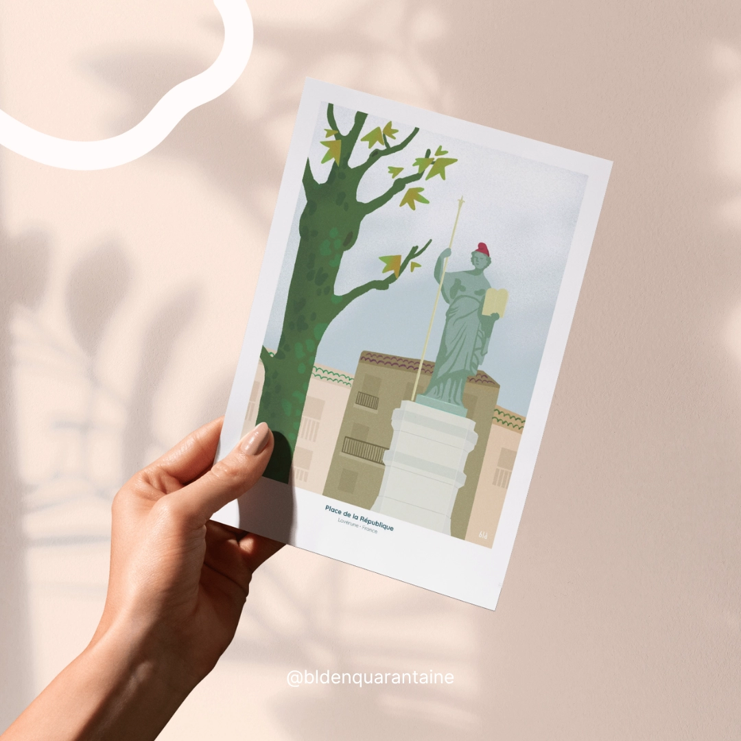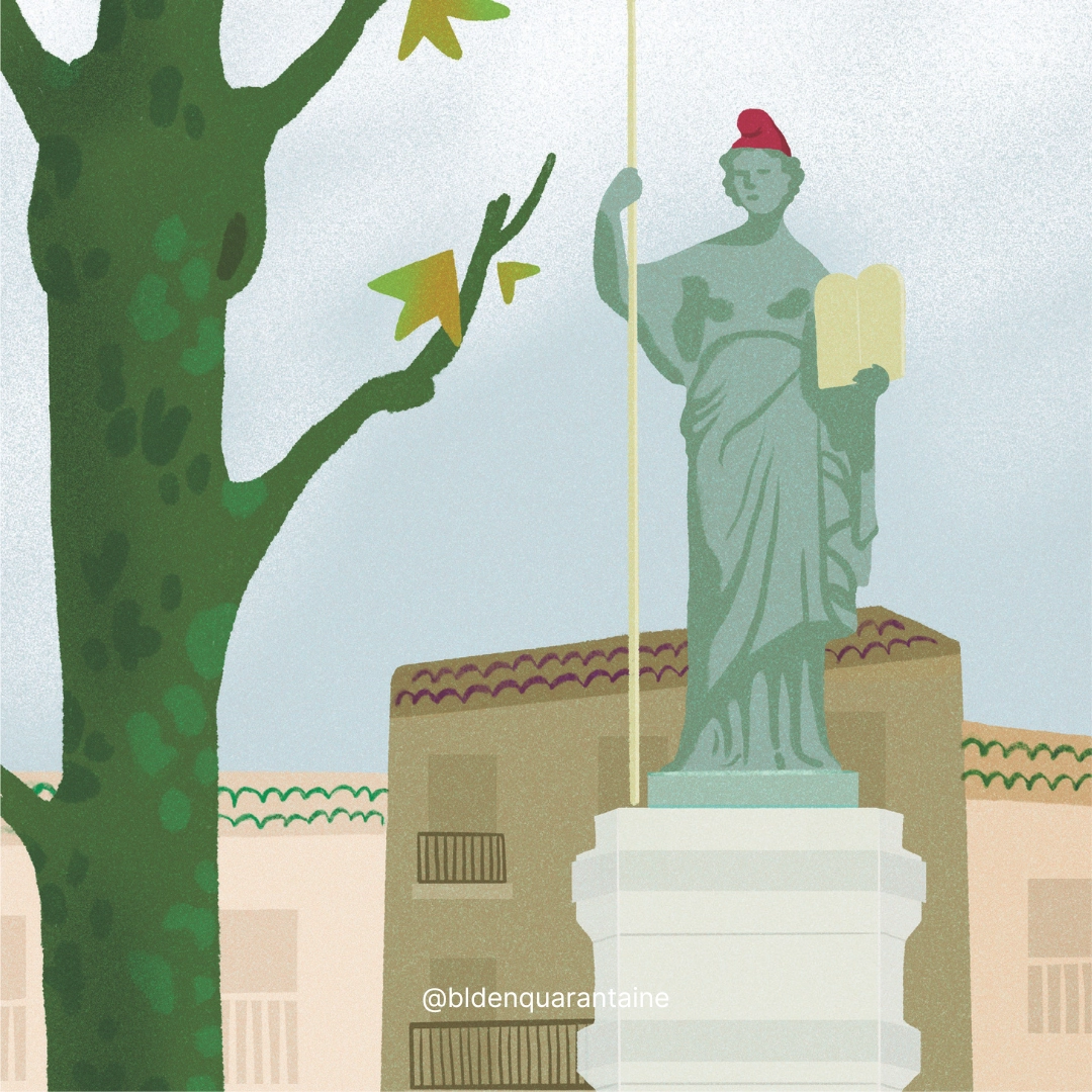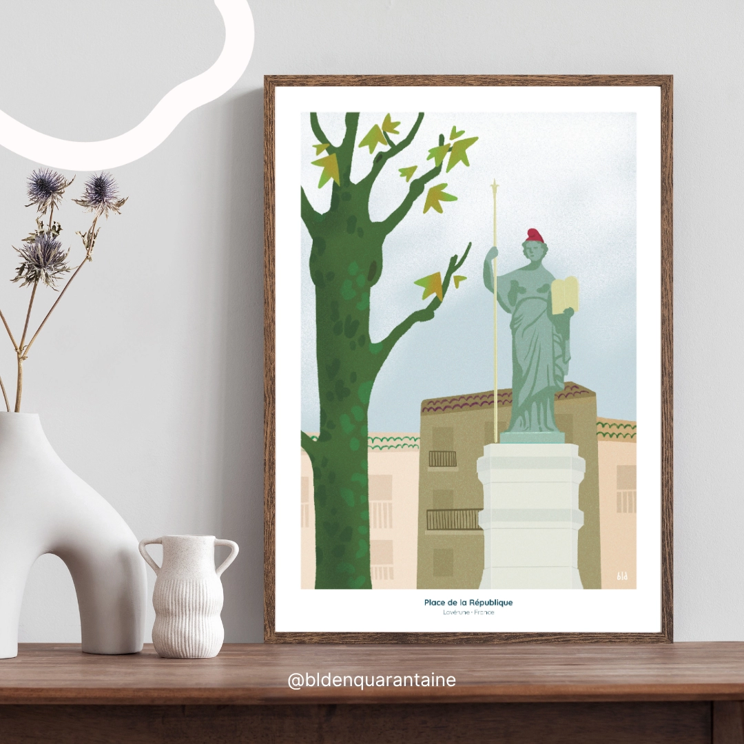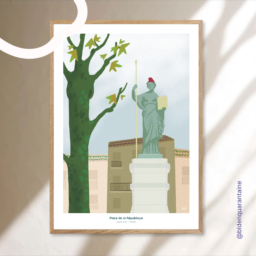 Cette illustration de la Place de la République à Lavérune met en lumière la belle statue de Marianne, symbole de la République française, et le grand platane qui domine la place. Elle capture le charme simple et modeste du village, tout en reflétant l’identité d’un village français typique, avec son patrimoine, ses espaces de rencontre et son atmosphère conviviale. L’illustration, réalisée dans un style doux et graphique, met en avant la statue de Marianne comme figure emblématique des valeurs républicaines – liberté, égalité, fraternité.