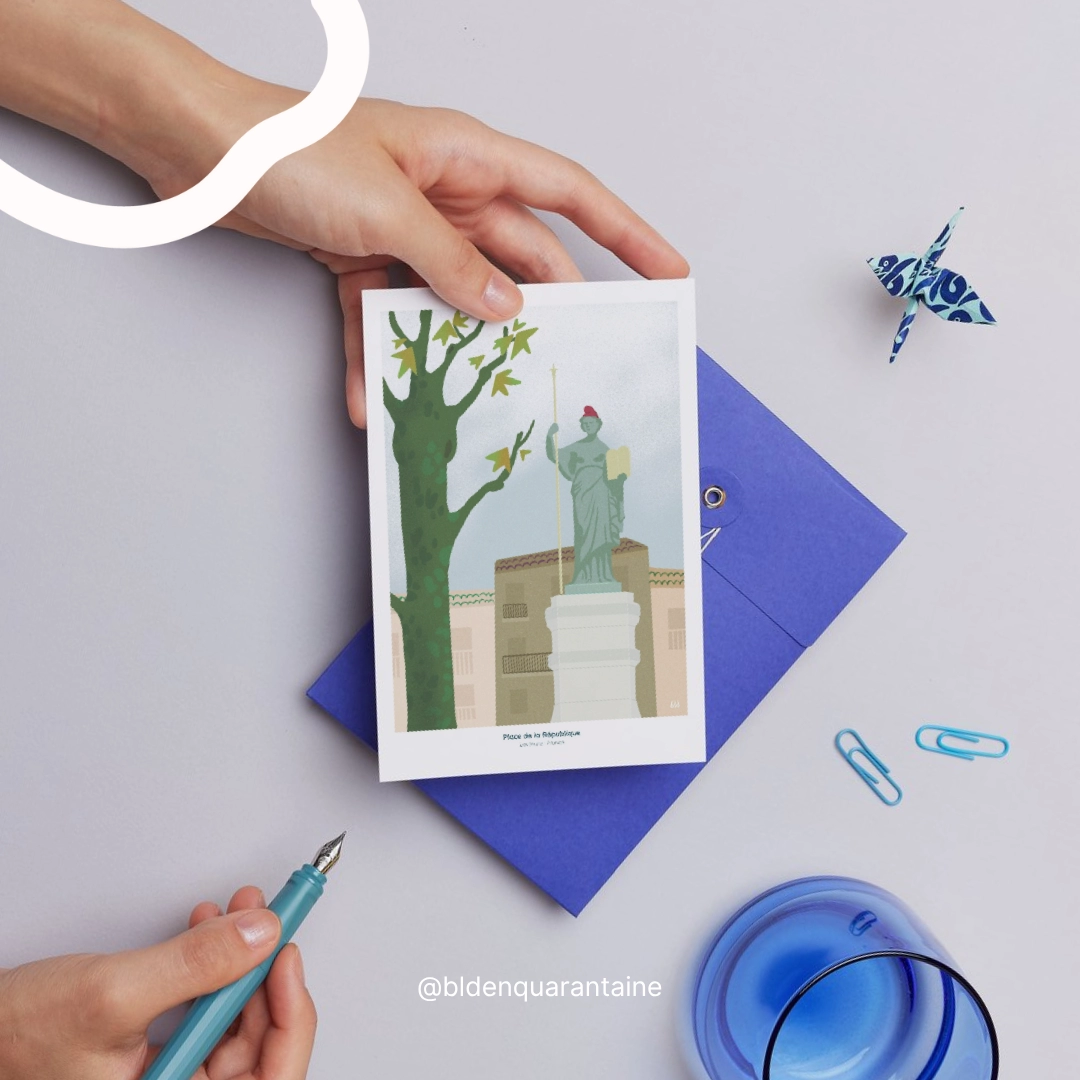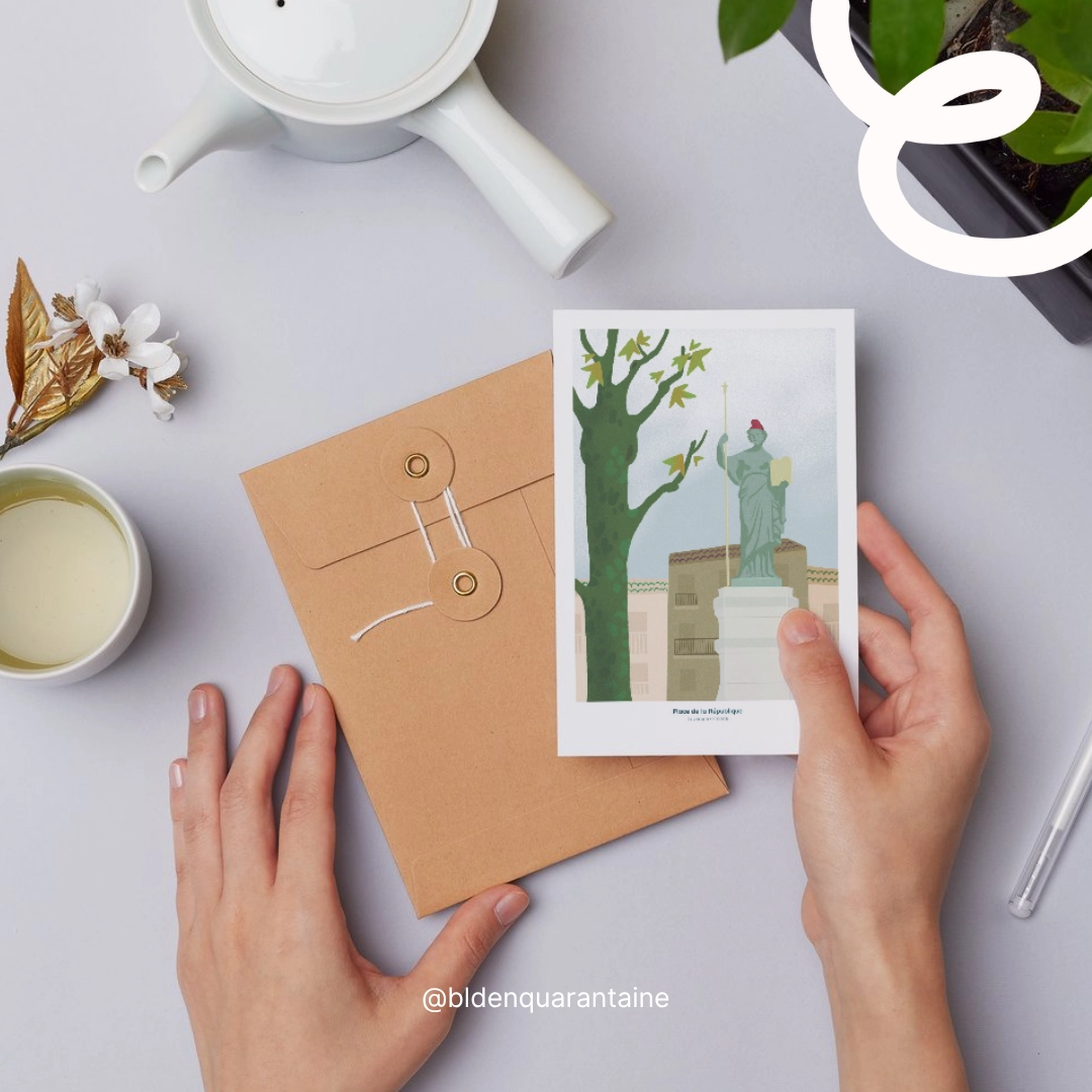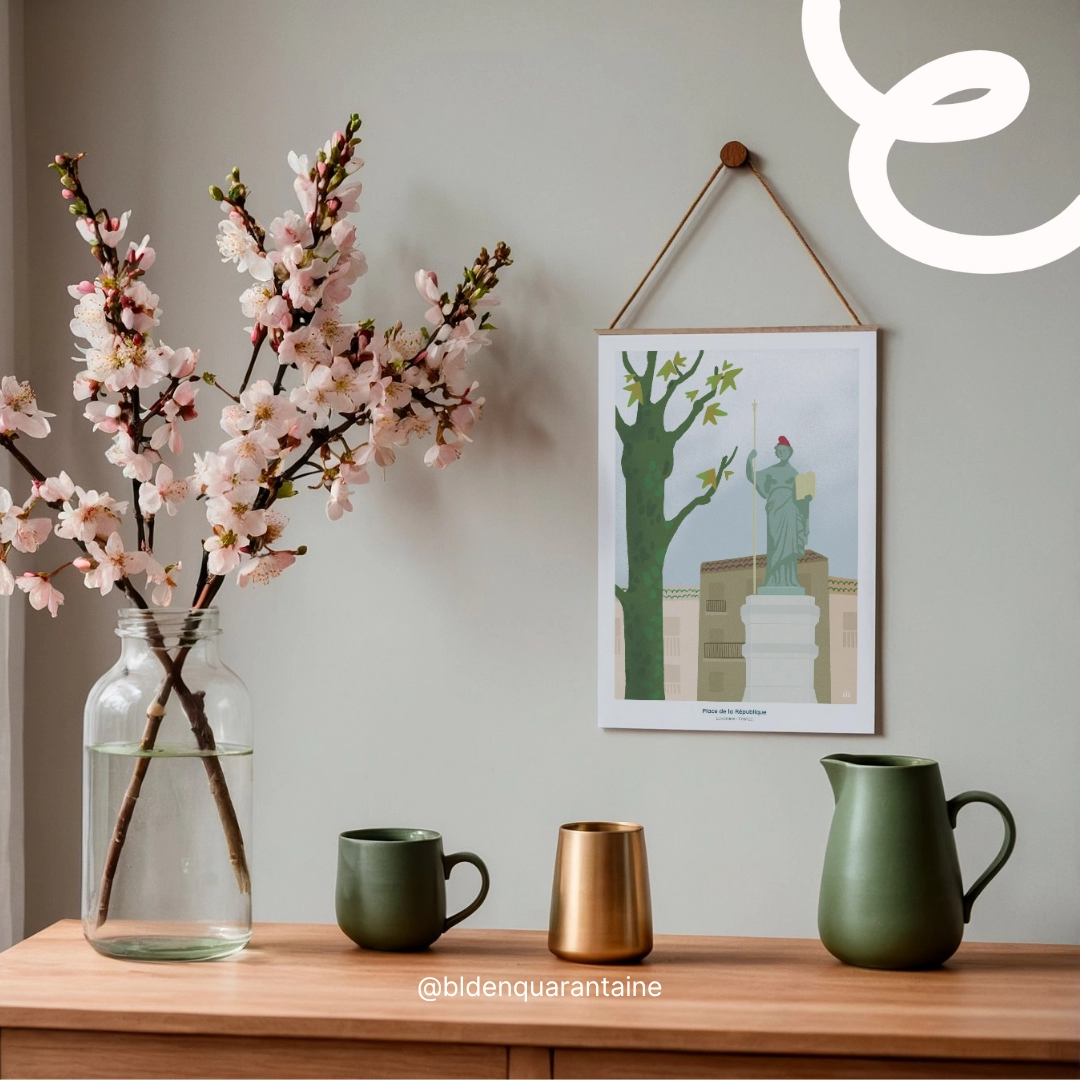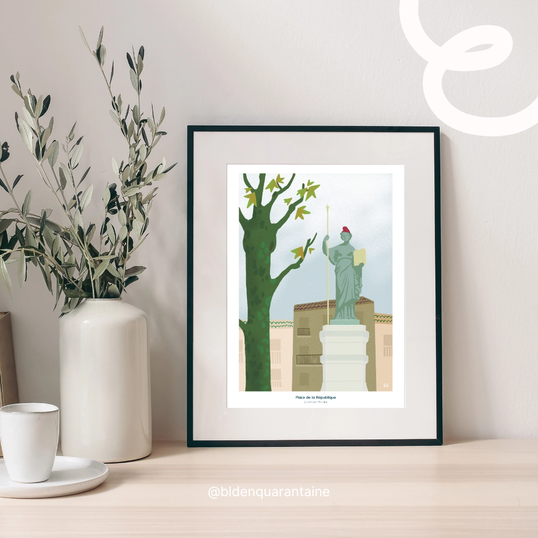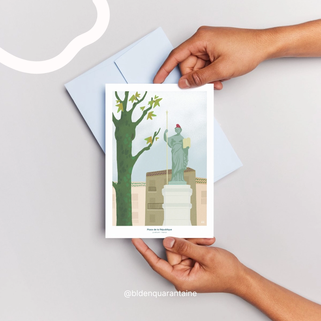 Cette illustration de la Place de la République à Lavérune met en lumière la belle statue de Marianne, symbole de la République française, et le grand platane qui domine la place. Elle capture le charme simple et modeste du village, tout en reflétant l’identité d’un village français typique, avec son patrimoine, ses espaces de rencontre et son atmosphère conviviale. L’illustration, réalisée dans un style doux et graphique, met en avant la statue de Marianne comme figure emblématique des valeurs républicaines – liberté, égalité, fraternité.